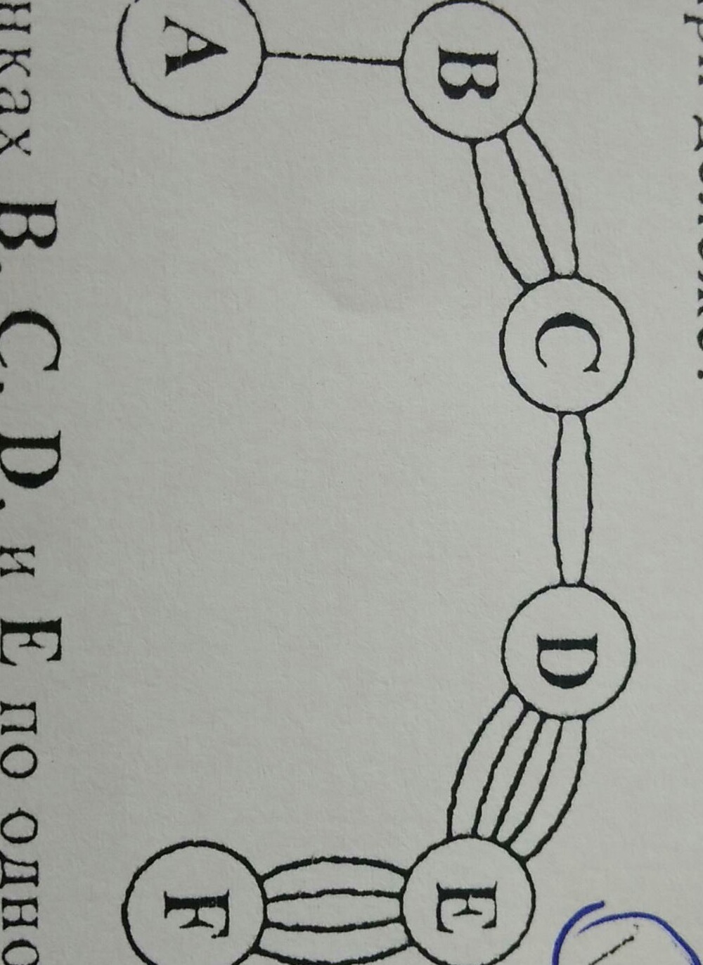 На рисунке показана схема расположения тропинок и полянок (A,B,C,D,E,F) в Дремучем лесу. Сколько существует способов попасть с полянки A на полянку F,побывав на полянку B,C,D и E по одному разу?