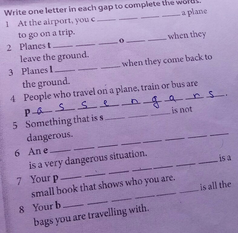 1 catch 2 take off 3 land 4 passengers 5 safe 6 emergency 7 passport 8 baggage