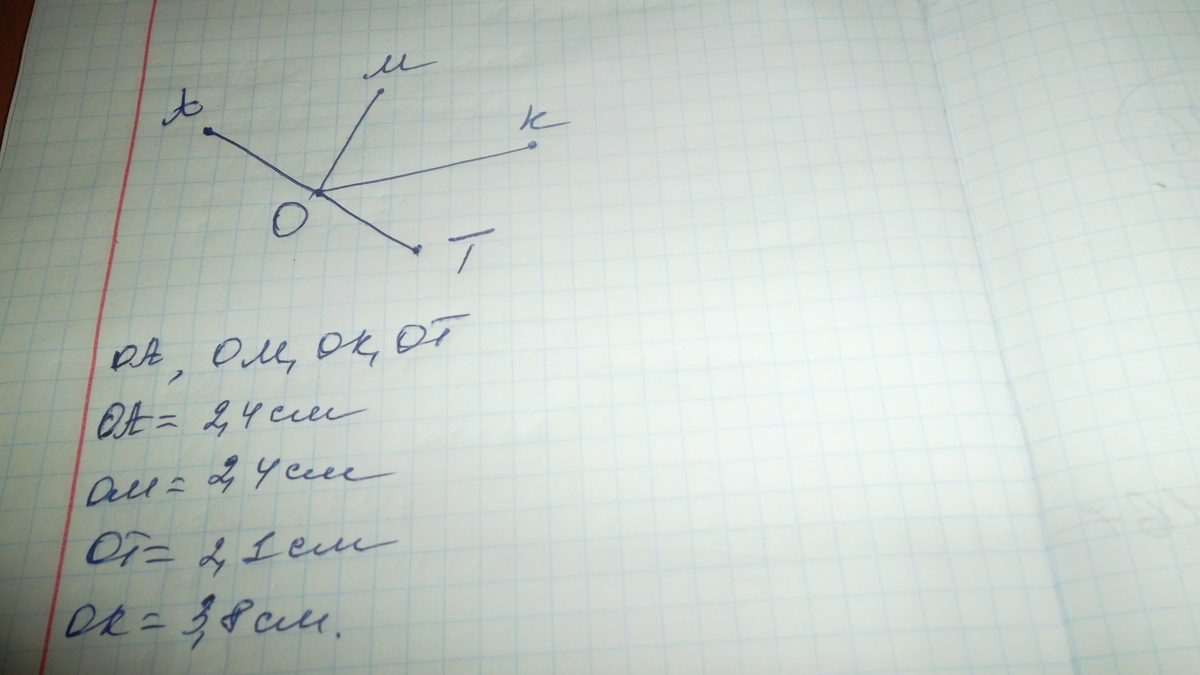 Отметьте в тетради пять точек - А,М,К,Т и О.Соедините точку О отрезками с каждой из остальных точек и запишите все получившиеся отрезки.Измерте отрезки ОА,ОМ,ОК и ОТ.