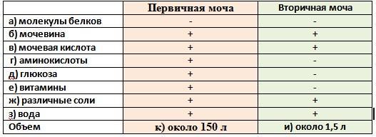 Сколько образуется в среднем за сутки первичной и вторичной мочи? Заполните таблицу. 1 первичная моча. 2 вторичная моча. а) молекулы белков б) мочевина в) мочевая кислота г) аминокислоты д) глюкоза е) витамины ж) различные соли з) вода и) около 1,5 л к) около 150 л