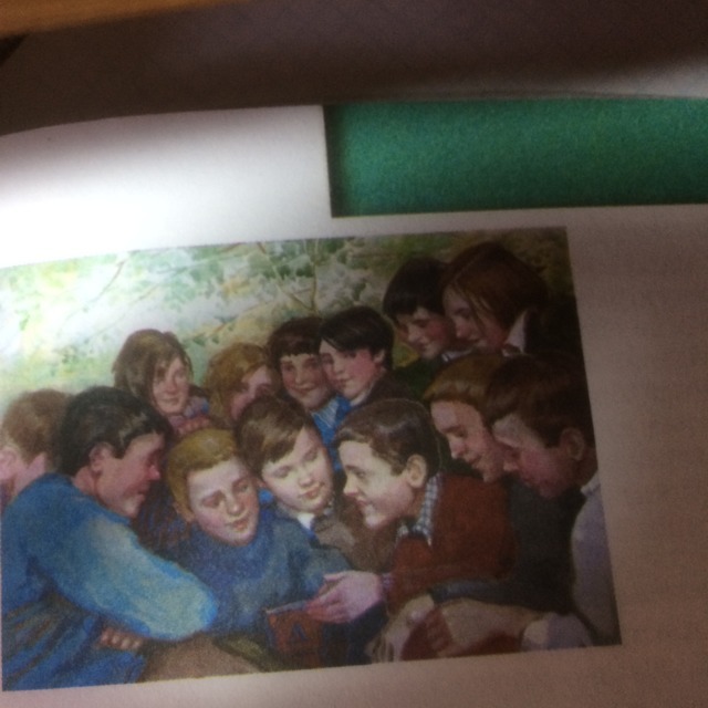 На переднем плане шестеро мальчиков, Один из них показывает им свою книгу.