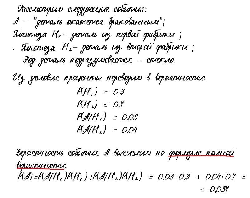 Две фабрики выпускают одинаковые стекла для автомобильных фар.Первая фабрика выпускает 30% этих стекол,вторая 70%.Первая фабрика выпускает 3% бракованных стёкол,а вторая-4%.Найдите вероятность того,что случайно купленное в магазине стекло окажется бракованным.