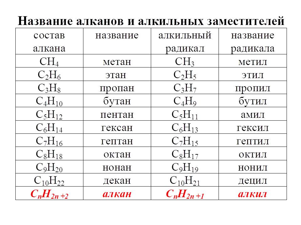 ряд родственных соединений в котором каждый следующий член отличается от предыдущего на постоянную группу атомов (-CH2-), этот ряд химических веществ называется гомологический ряд. Гомологический ряд алканов легко составить, прибавляя каждый раз к предыдущей цепочке новый атом углерода и дополняя его оставшиеся валентности до 4-х атомами водорода. Другой вариант – добавление в цепь группы -СН2-