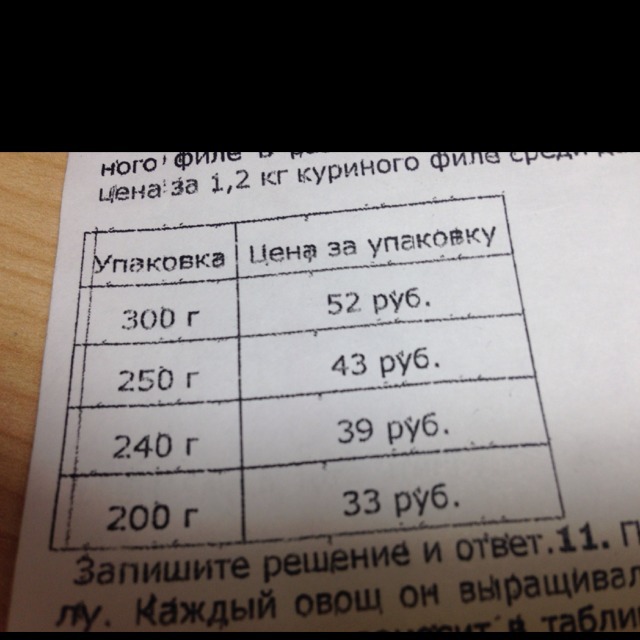В магазине продаётся несколько видов куриного филе в различных упаковках и по различной цене. Какова наименьшая цена за 1,2 кг куриного филе среди данных в таблице видов?