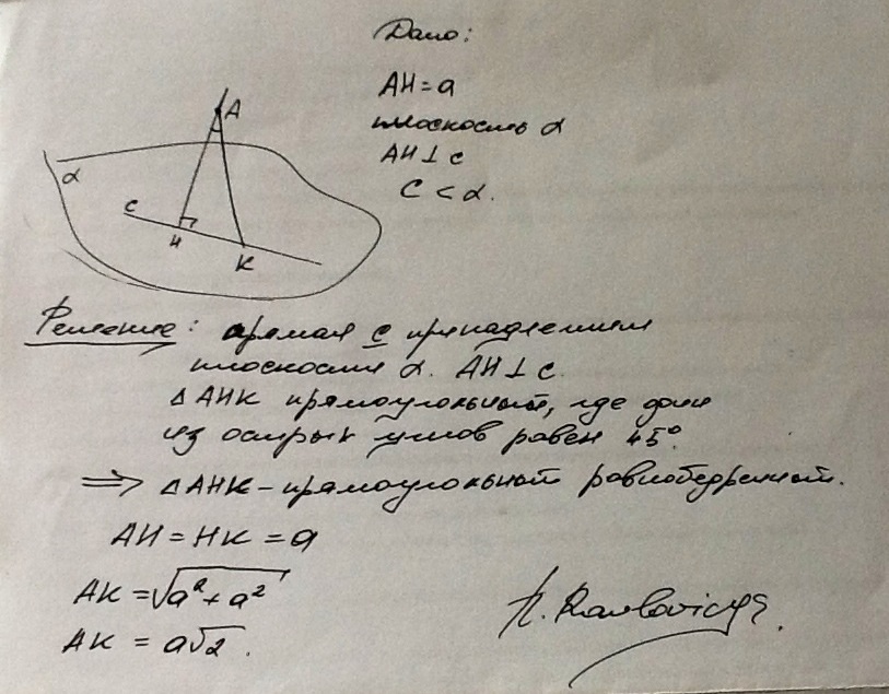 Из некоторой точки проведены к данной плоскости перпендикуляр, равный а, и наклонная; угол между ними равен 45°. Найти длину наклонной.