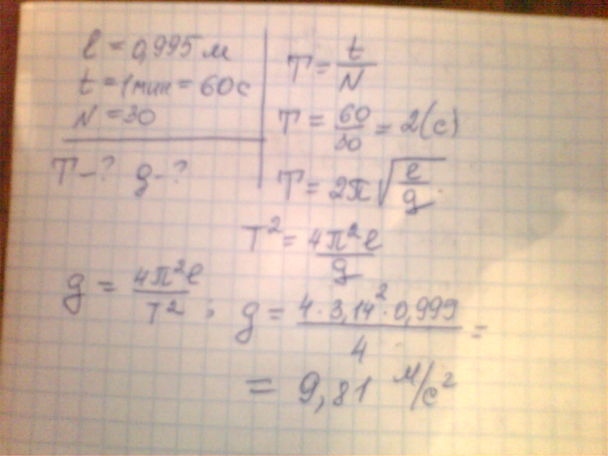 Математический маятник длиной 99.5 (см) за 1 (мин) совершает 30 полных колебаний. Определить период колебания маятника и ускорение свободного падения в том месте, где находится маятник.