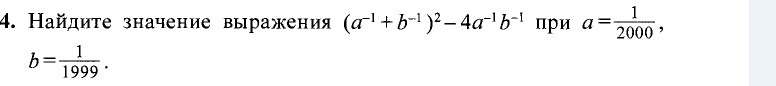 (a⁻¹+b⁻¹)²-4a⁻¹b⁻¹ = (a⁻¹)²+2*a⁻¹b⁻¹+(b⁻¹)²-4a⁻¹b⁻¹ = a⁻²+2a⁻¹b¹+b⁻²-4a⁻¹b⁻¹ = a⁻²-2a⁻¹b⁻¹+b⁻² = (a⁻¹-b⁻¹)² = ((1/2000)⁻¹-(1/999)⁻¹)² = (2000-1999)² = 1² = 1