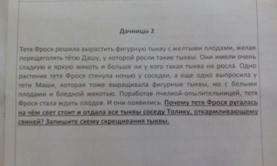 Попробуем подумать логически и найти подсказки в тексте самой задачи. Во-первых, мы знаем, что такие сладкие тыквы кроме как у тети Даши больше ни у кого не растут, значит этот признак проявляется не часто, следовательно он рецессивный и может быть только в гомозиготном состоянии. Еще больше нашу уверенность в этом укрепляет то, что тетя Фрося ругалась когда увидела результаты своего скрещивания. Теперь разберемся с подарком тети Маши. Так как в итоге на корм свиньям был отдан весь урожай, никакого расщепления в результате скрещивания не получилось, значит и тыквы тети Маши гомозиготны, но уже по доминантному признаку.