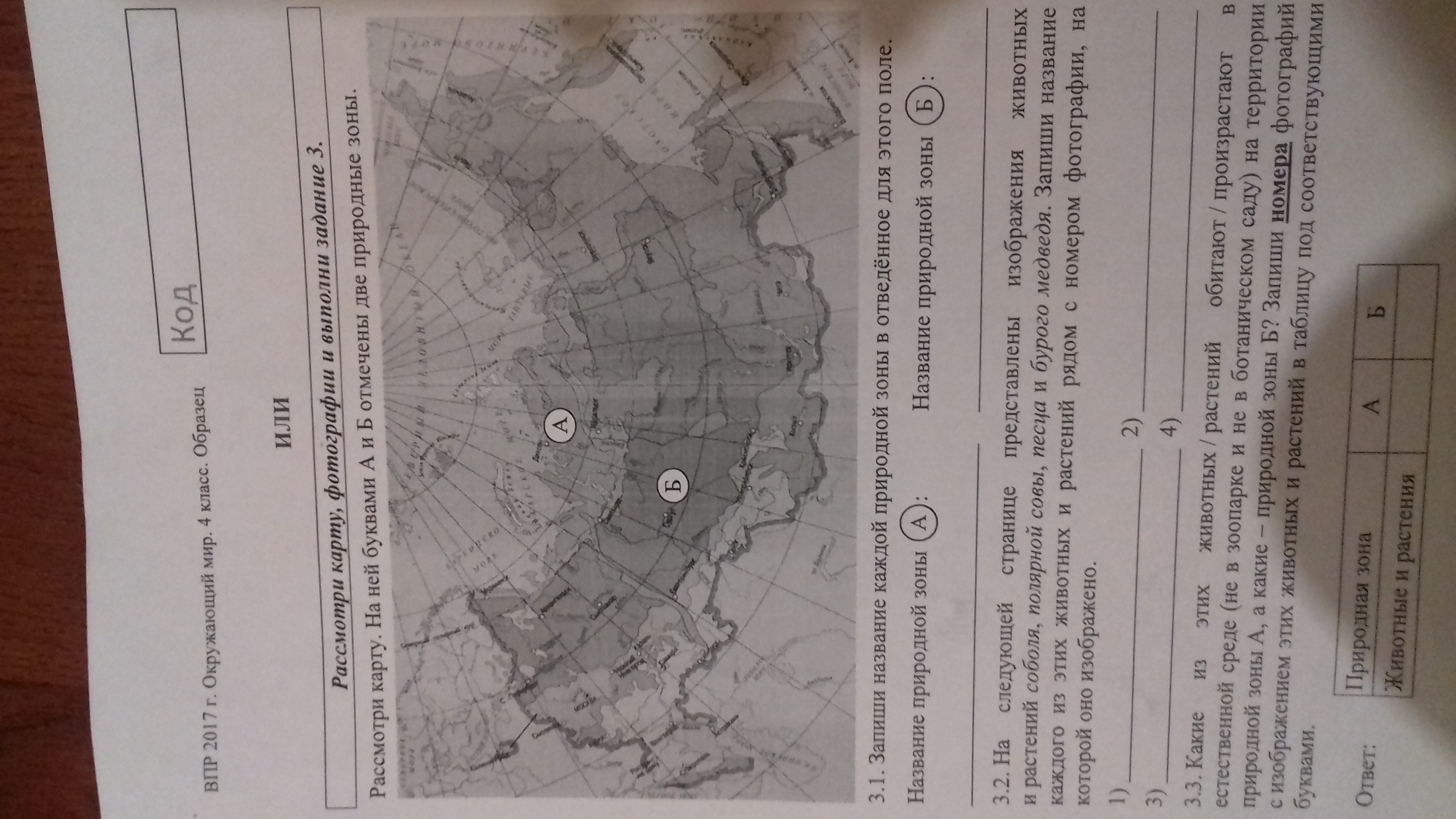 Рассмотри карту. На ней буквами А и Б отмечены две природные зоны. Запиши название каждой природной зоны в отведённое для этого поле.