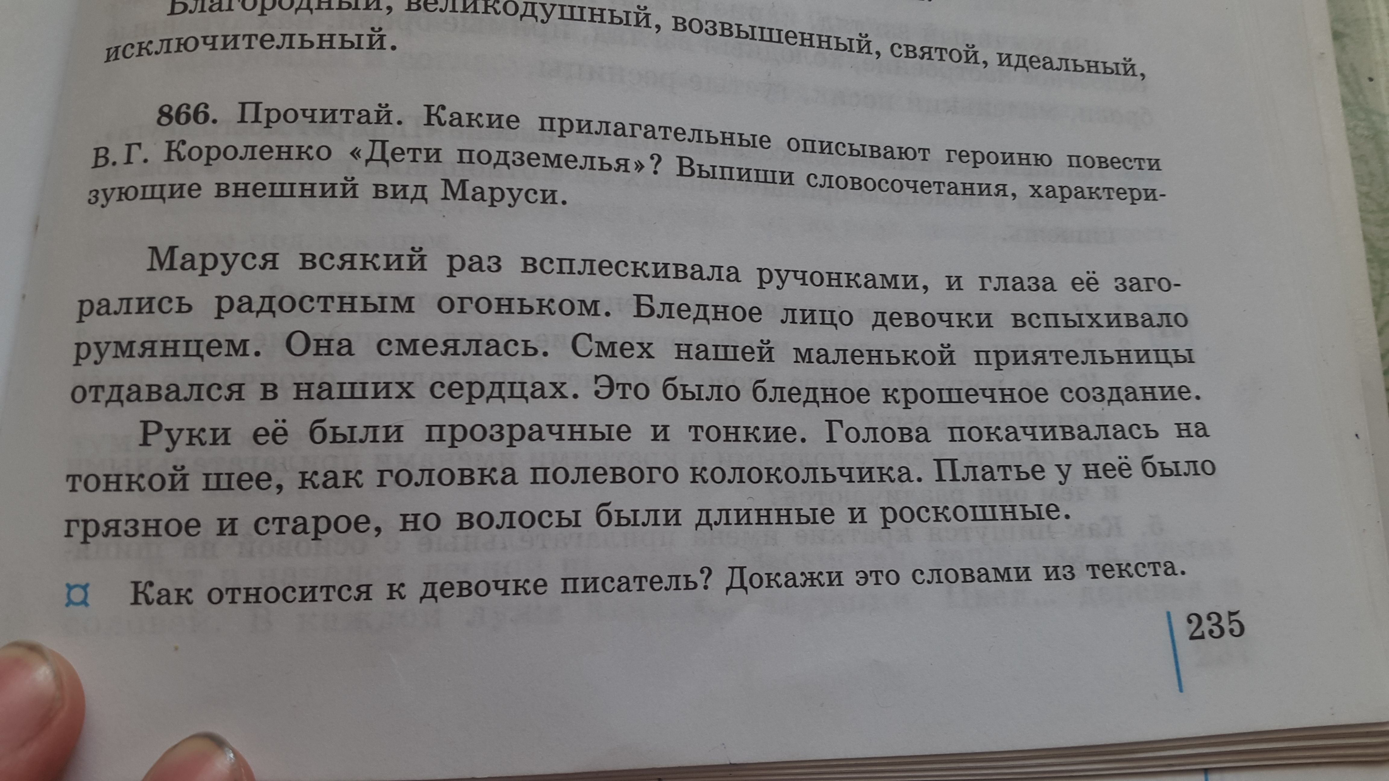 Бледное лицо, крошечное создание, руки прозрачные и тонкие, тонкая шея, платье грязное и старое, волосы длинные и роскошные.