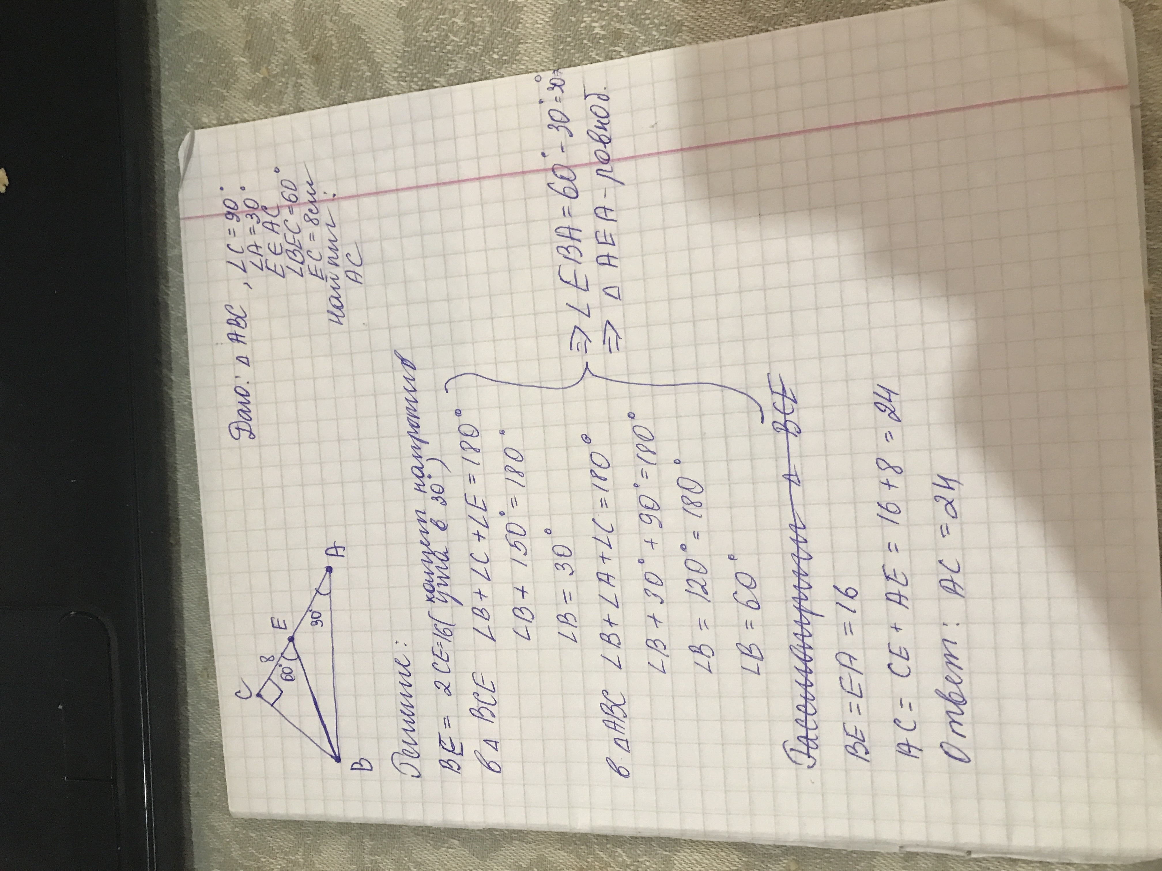 в треугольнике ABC известно,что угол C =90 градусов,угол A =30 градусов.На катете AC отметили точку E так ,что угол BEC = 60 градусов.Найдите катет AC, если EC = 8 см
