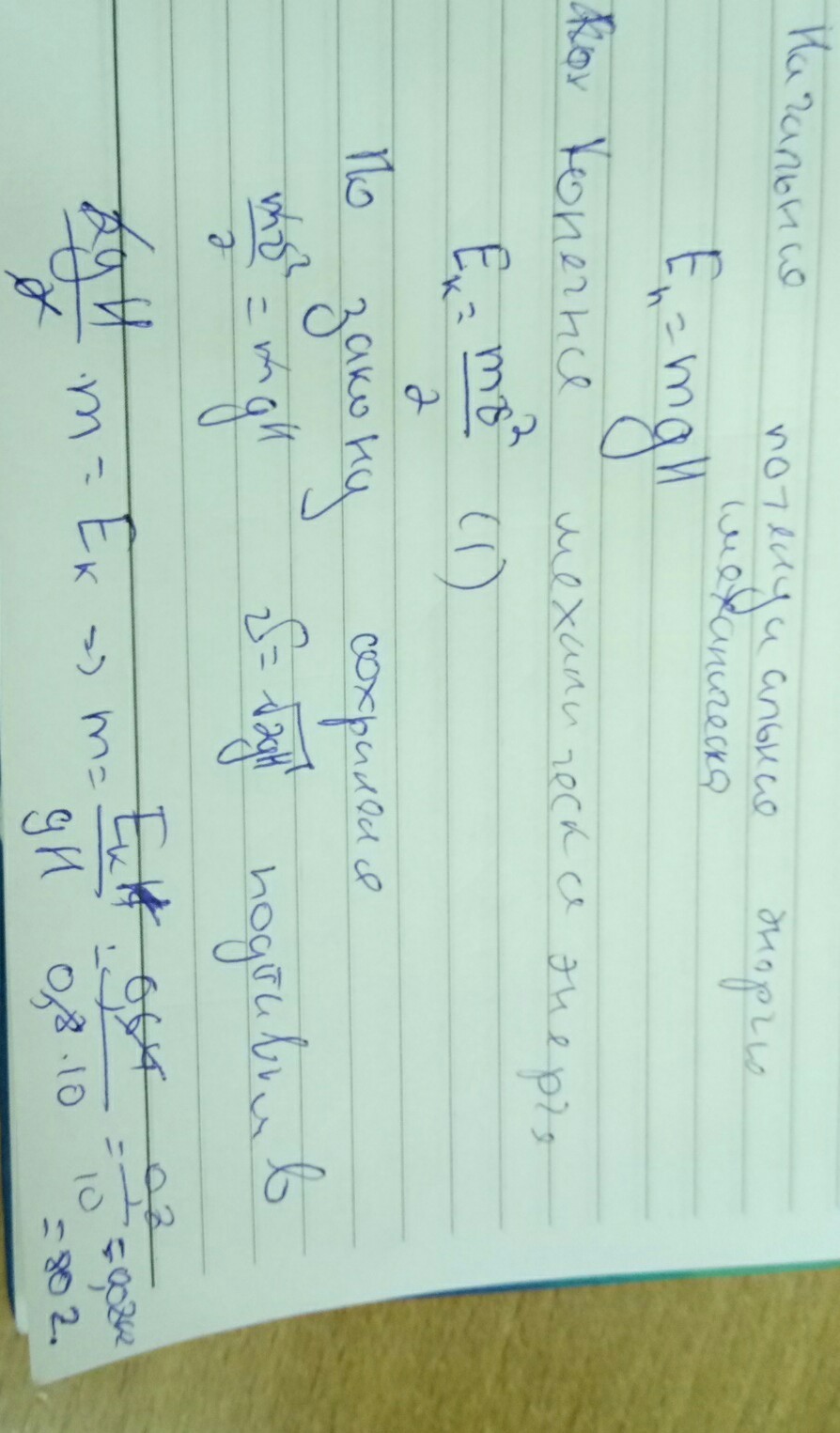 со стола высотой 0,8м падает ручка. в момент падения кинетическая энергия 0,64 Дж. пренебрегая сопротивлением воздуха, расчитайте массу ручки