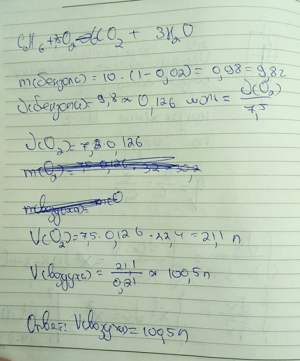 какой объем воздуха потребуется для полного сжигания 10 г бензола,содержащего 2% негорючих примесей