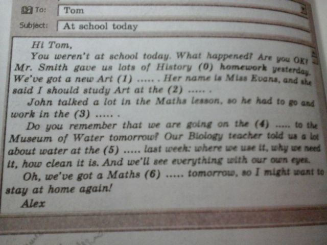 Ты сегодня не был в школе. Что случилось? Ты в порядке? Вчера Мистр Смит задал нам много домашнего задания по истории. У нас новый учитель по рисованию. Ее имя мисс Эванс, и она сказала, что я должен учиться рисованию в университете.