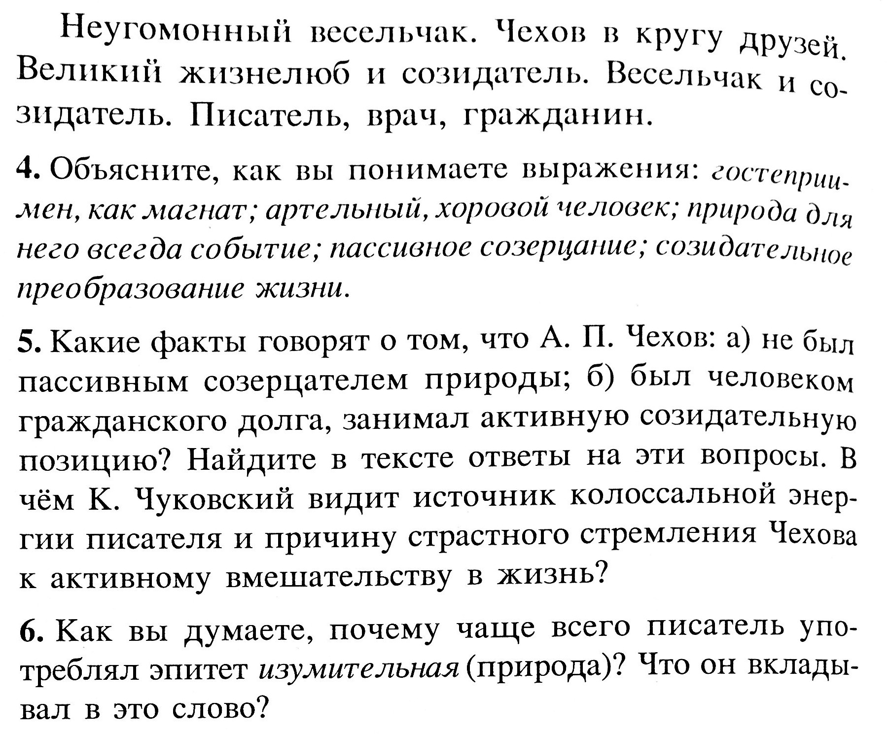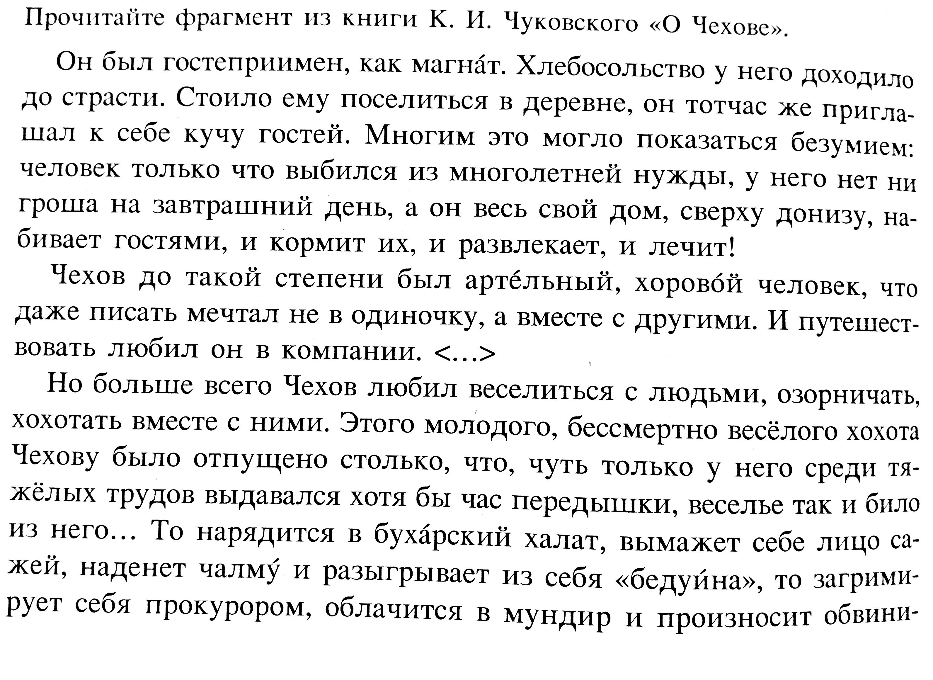 1) К.Чуковский говорит о Чехове, что тот был гостеприимен, как магнат. Писатель не был богатым человеком в прямом смысле этого слова, порой у него даже не было «гроша на завтрашний день», но это для Чехова это ровным счетом не имело значения: он всегда принимал гостей на широкую ногу, проявляя свою широкую натуру, ведь «хлебосольство у него доходило до страсти».