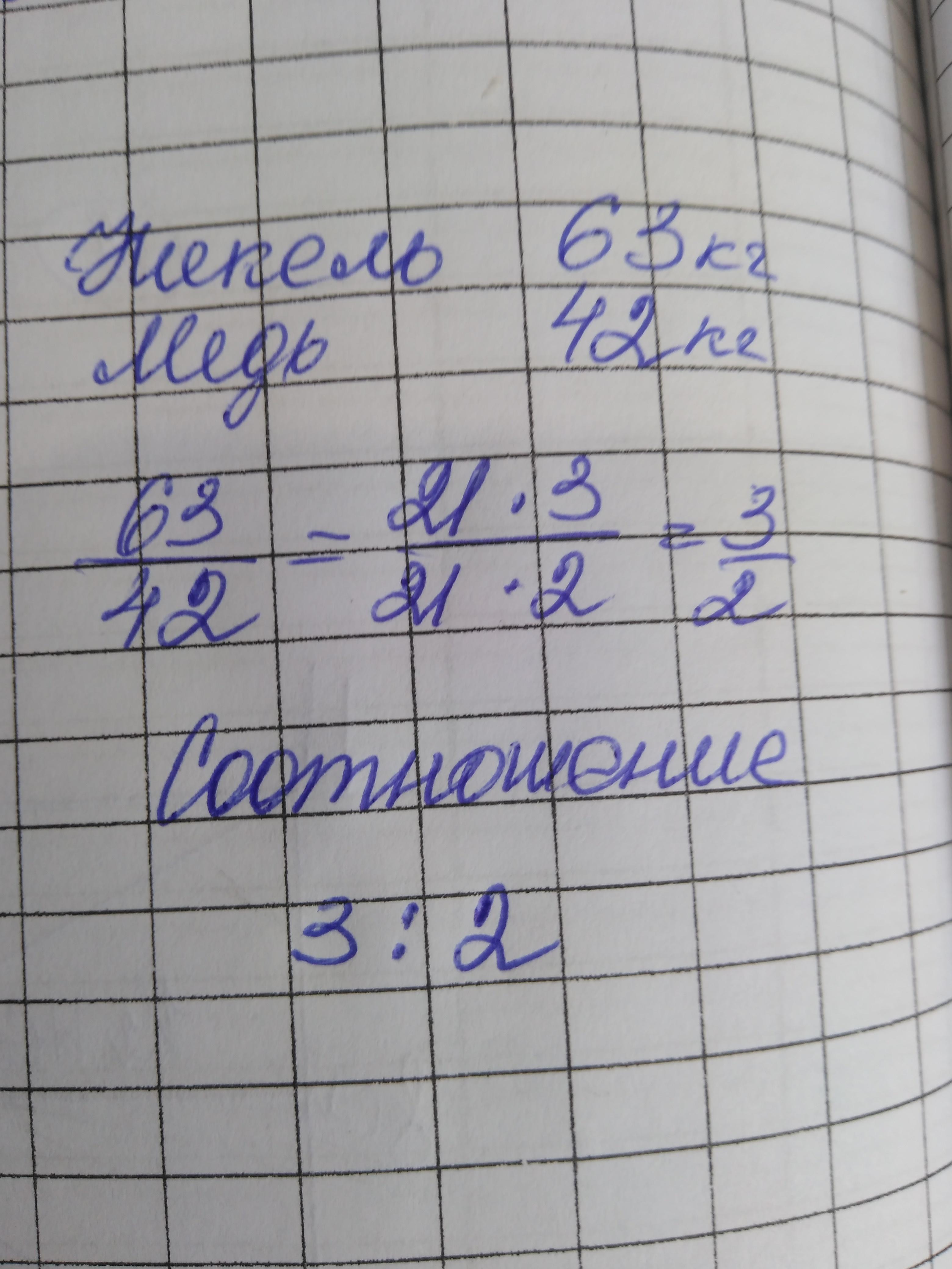 Сплав из никеля и меди содержит 63 кг никеля и 42 кг меди. В каком отношении взяты никель и медь? Ответ (если это необходимо, сократи дробь):никель и медь взяты в отношении