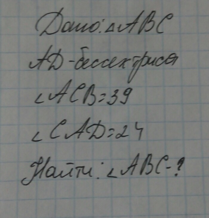 Ответ 93 , тк АД биссектриса она делит угол А на пополам , одна его часть известна , 24 , значит вторая тож 24 т.е вся сторона А 48 , из этого следует что нам даны 2 и з 3 углов , сумма углов треугольника 180 значит 180-48-39=93