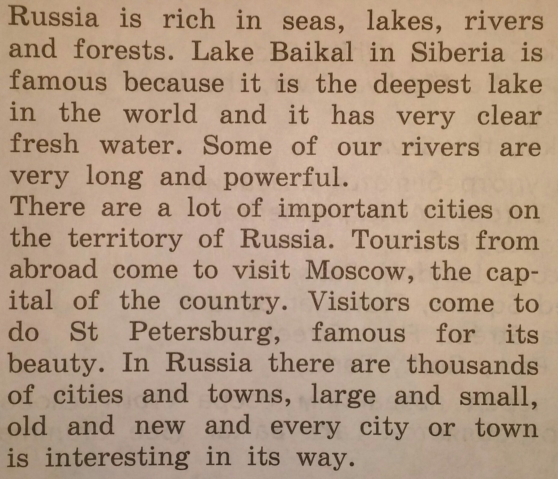 Россия богата морями, озерами, реками и лесами. Озеро Байкал в Сибири славится тем, что это самое глубокое озеро в мире, и оно имеет очень чистую пресную воду. Некоторые из наших рек очень длинные и мощные. На территории России очень много важных городов. Туристы из-за рубежа приезжают в Москву, столицу страны. Посетители приезжают в Санкт-Петербург, славящийся своей красотой. В России есть тысячи городов и поселков, больших и маленьких старых и новых, и каждый город или город интересен в своем роде.
