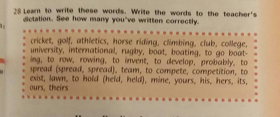 крикет(это спорт такой,заимствованное слово),гольф,лёгкая атлетика,верховая езда,альпинизм,клюшка,колледж,университет,международный,рэгби,лодка,катание на лодках,кататься на лодках,грести,гребля,изобретать,развивать,наверняка,распространять(это неправильный глагол,там три формы),команда,соревноваться,соревнование,существовать,газон,держать(опять же непр гл),мой,твой,его,её,его(среднее лицо,только к неодушивлённым),наше,их(принадлежание)