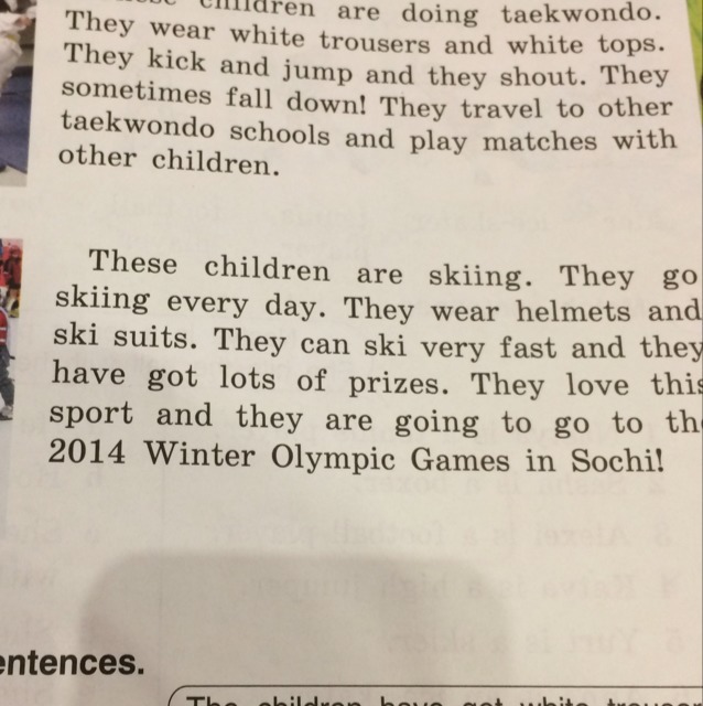Эти дети катаются на лыжах. Они катаются на лыжах каждый день. Они носят лыжные костюмы и шлемы. Они могут кататься на лыжах очень быстро, и у них есть много призов. Они любят этот вид спорта и собираются отправиться на зимние Олимпийские игры 2014 года в Сочи!