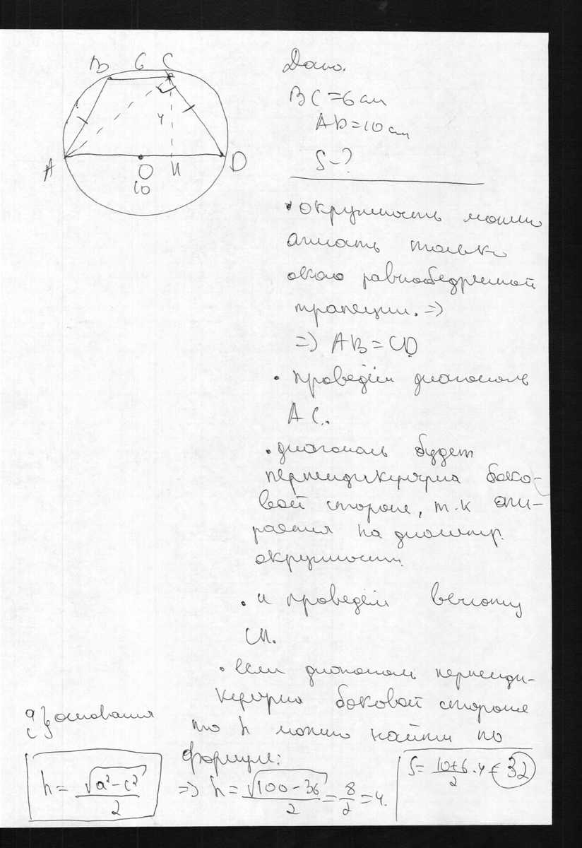 Трапеция с основаниями 6см и 10см вписана в окружность. Центр этой окружности находится на большом основании. Найти площадь трапеции.
