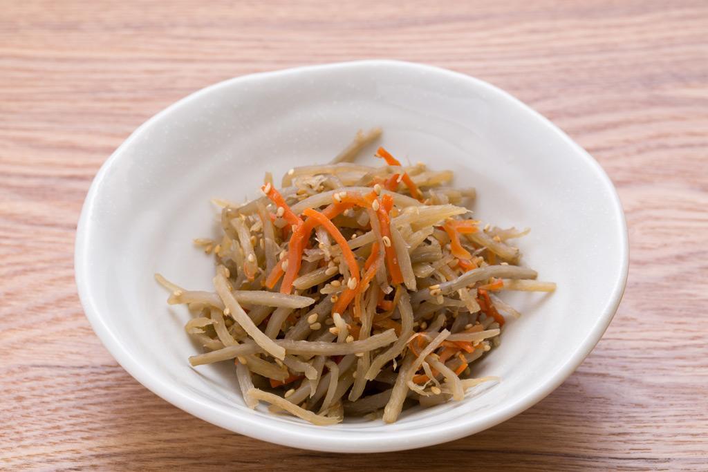 Тушеные стебли лопуха с кунжутом и соевым соусом.