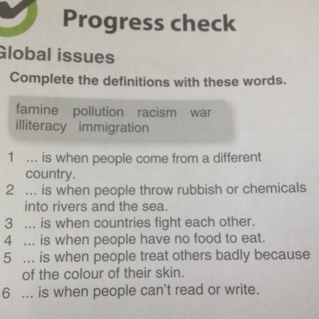 1- immigration,2-pollution,3- war,4-famine,5-racism, 5-illiteracy