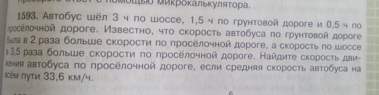 средняя скорость= весь путь : всё время. Из этого соотношения составляем уравнение. Весь путь = 3*3,5Х+ 1,5*2Х+0,5Х (Х - скорость по просёлочной дороге). Всё время= 3+1,5+0,5 = 5 часов.