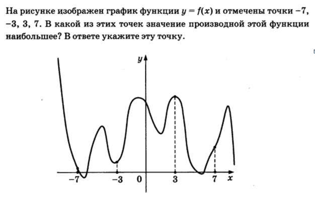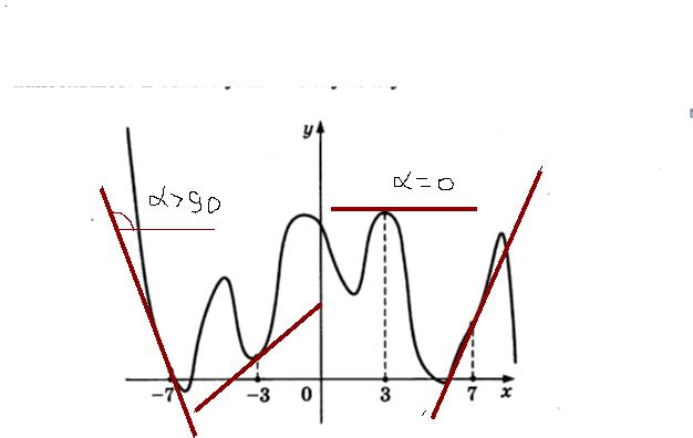 Строим касательные в точках и смотрим на них. В точке -7 угол наклона касательной больше 90 и танген значит отрицательный. В точке 3 угол равен нулю и тангенс и производная все равны нулю. Осталось рассмотреть точки