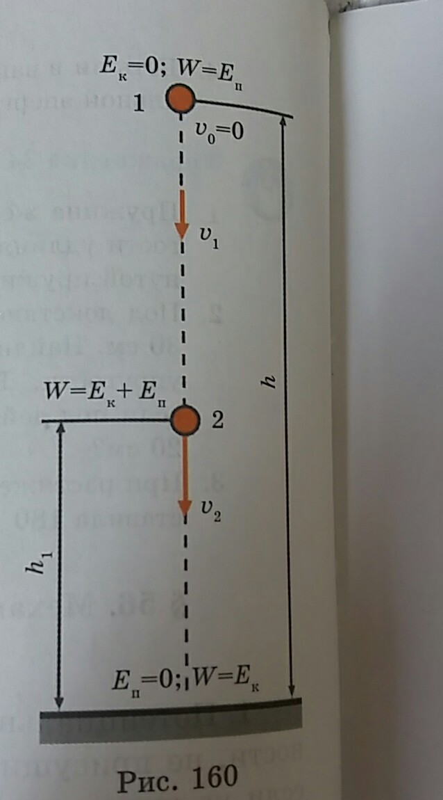 Тело поднятое на расстояние 1 - Кинетическая энергия которого = 0, а W = потенциальной энергии, отпустили в свободное падение, пролетев некое расстояние h2 оно оказалось в точке 2 где W = сумме кинетической и потенциальной энергии, дальше тело пролетает высоту h1 и коснувшись земли её потенциальная энергия = 0, а W = кинетической энергии.