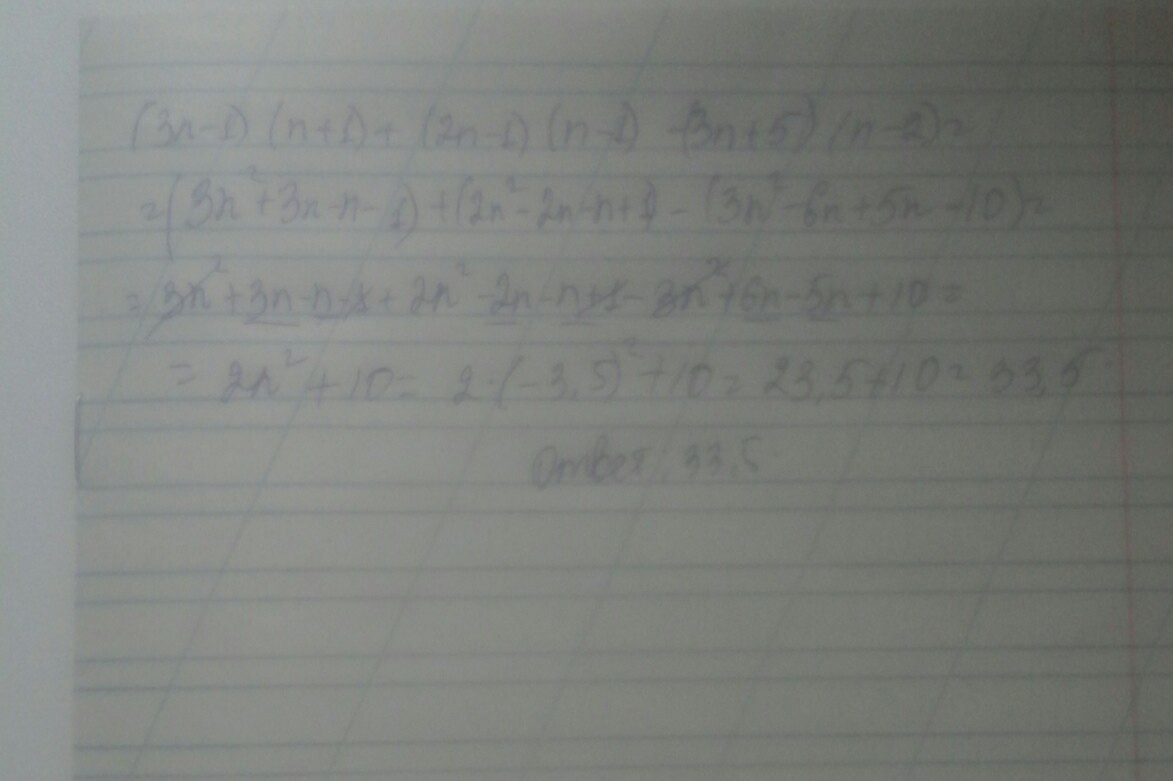 (3n-1)(n+1)+(2n-1)(n-1)-(3n+5)(n-2)=3n²+3n-n-1+2n²-2n-n+1-(3n²-6n+5n-10)=3n²+3n-n-1+2n²-2n-n+1-3n²+6n-5n+10=3n²+2n²-3n²+3n-n-2n-n+6n-5n-1+1+10=2n²+10