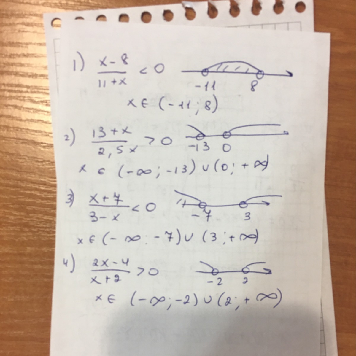 решение неравенств1) x-8÷11+x<0 2)13+x÷2,5x>0 3)X+7÷3-x<0 4)2x-4÷x+2>0
