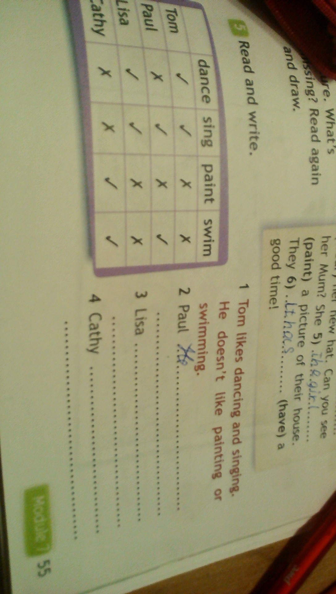 Lisa likes dancing and singing.She doesn't like painting and swimming.