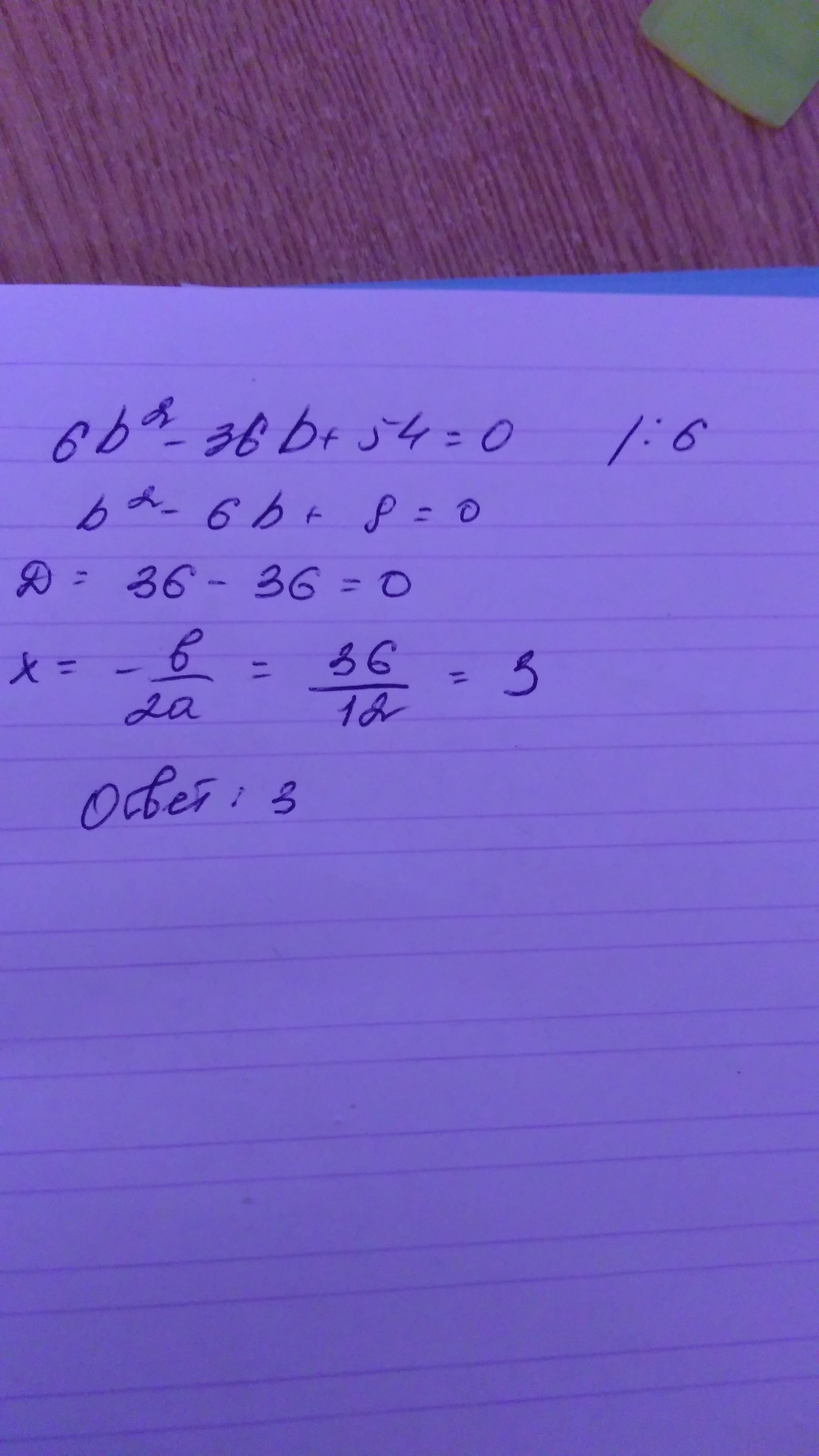 В начале делишь на 6 все уравнение, а затем расчитываеш по формуле дискриминанта т.к это квадратное уравнение