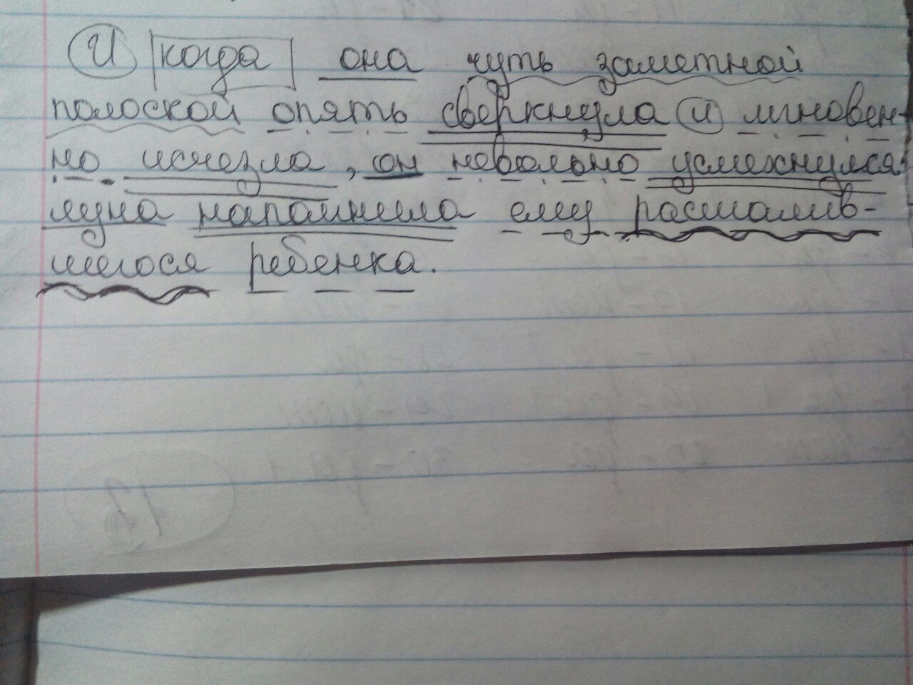 помогите сделать синтаксический разбор. И когда она чуть заметной полоской опять сверкнула и мгновенно исчезла,он невольно усмехнулся: луна напоминала ему расшалившегося ребенка