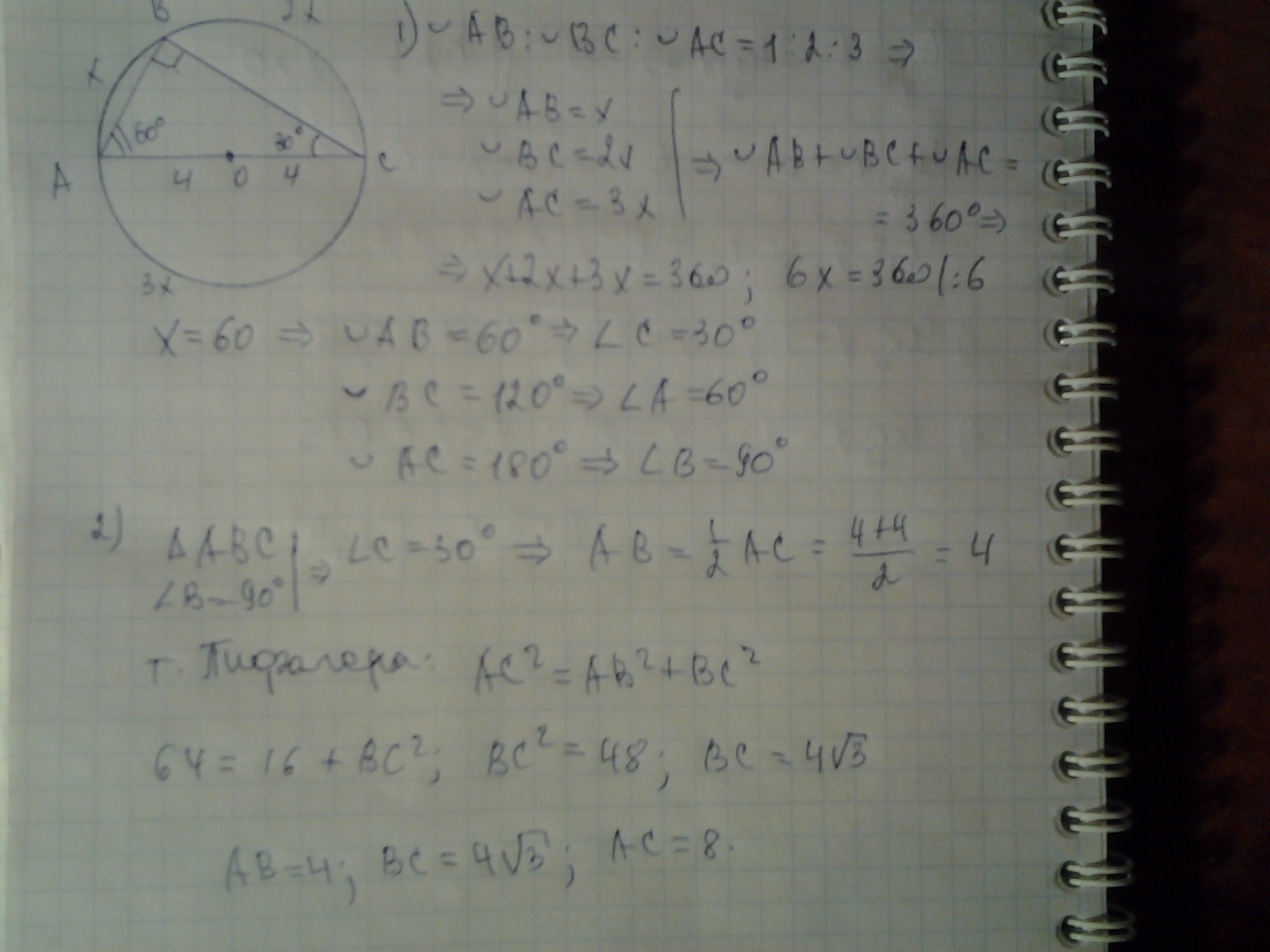 Применены : свойство вписанного угла, свойство катета против угла в 30 градусов, теорема Пифагора
