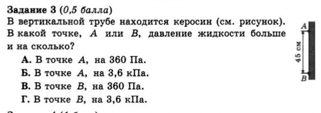 В вертикальной трубе находится керосин (см. рисунок). В какой точке ,А или Б, давление жидкости больше и на сколько?