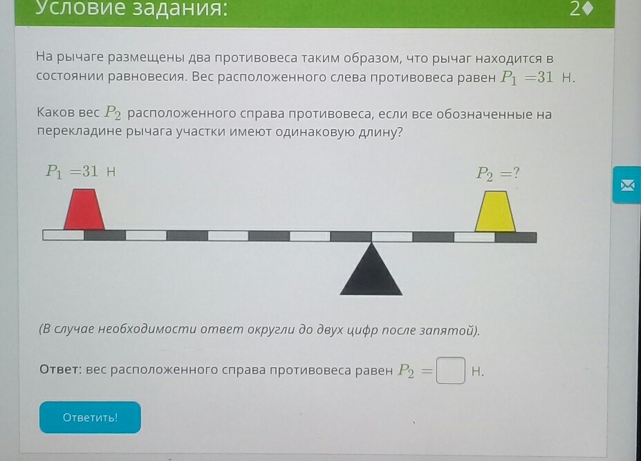 Так как система в равновесии, то моменты относительно точки равновесия равны, как известно момент это сила на плечо: