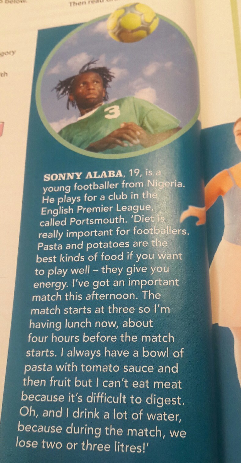 сонни алаба, 19, молодой футболист из нигерии. Он играет за клуб, в английской премьер лиге, который называется портсмауф. "диеты реально очень важны для футболистов. паста и картошка- это лучшая еда, если ты хочешь играть хорошо-они дают много энергии. у меня будет очень важный матч сегодня днем. матч начинается в три, так что я обедаю сейчас, за 4 часа до начала матча. я всегда ем миску пасты с томатным соусом и фрукты, но я не могу есть мясо, потому что оно долго переваривается. о, а еще я пью много воды, потому что за матч мы теряем 2 или 3 литра воды