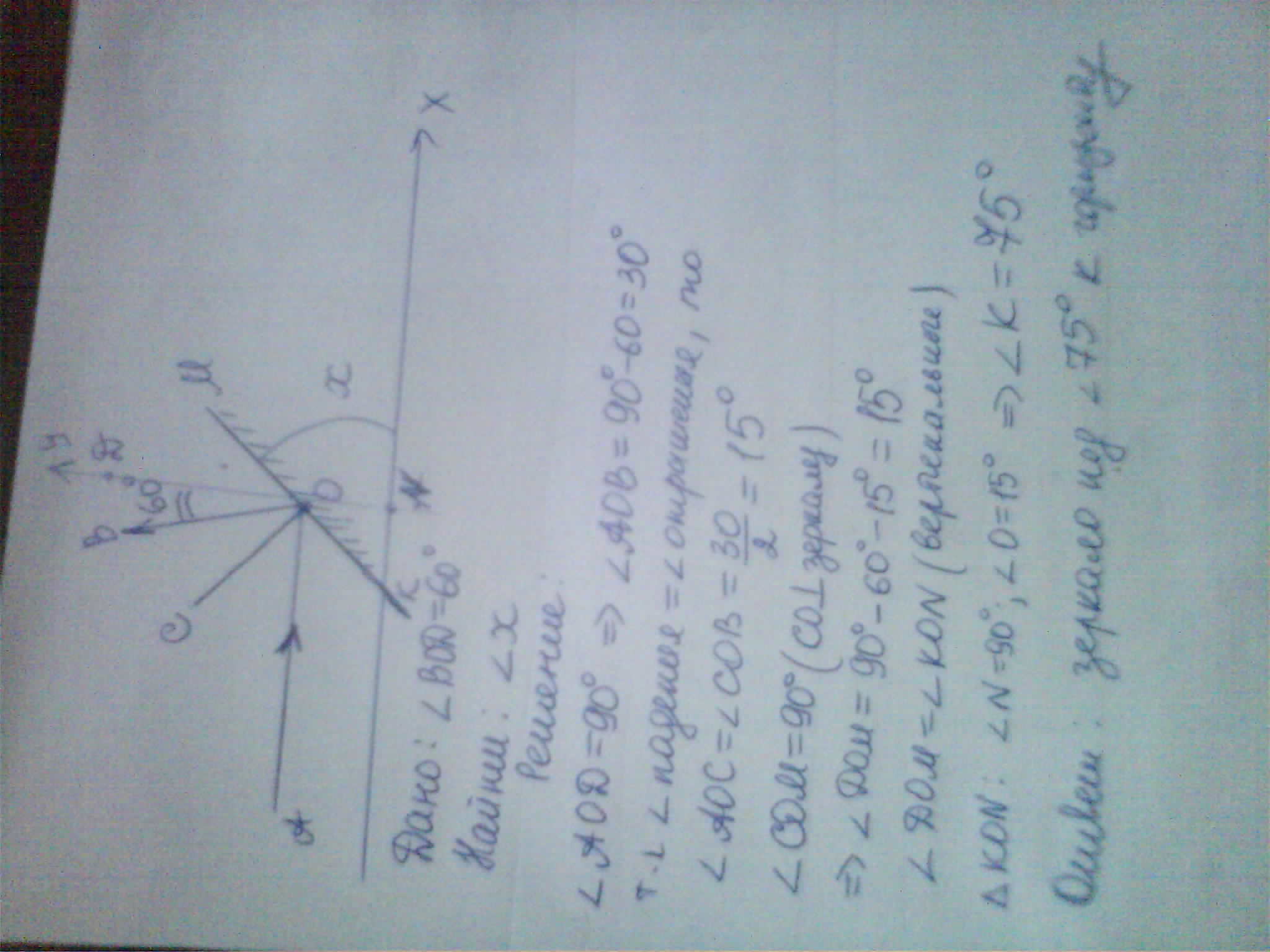 Пучок параллельных лучей распространяется в горизонтальном направлении. Как необходимо расположить зеркало, что бы после отрожения пучёк шел вверх под углом 60° к вертикали? нарисуйте ход луча и положение зеркала.