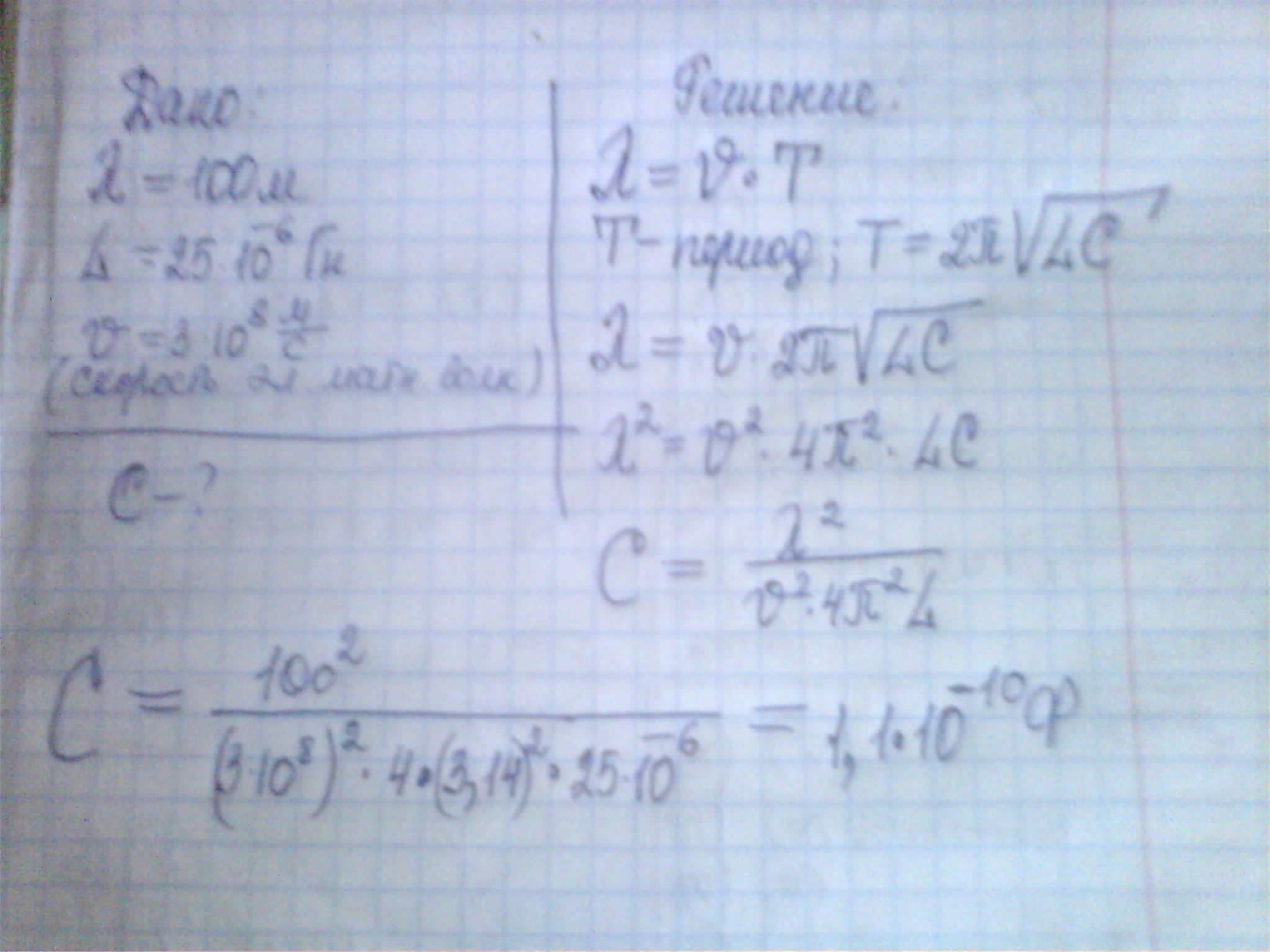 Какой должна быть емкость конденсатора, чтобы вместе с катушкой, индуктивность которой 25 мкГн, обеспечить настройку на резонансную длину волны 100 м?