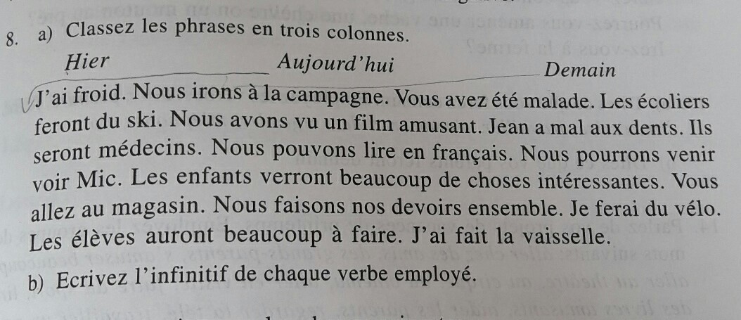 Вчера Сегодня Завтра я замерзла. Мы пойдем в поход. Вы заболели. Школьники на лыжах. Мы видели, были зубы. забавный фильм. Жан будет врачом. Мы можем читать по-французски. Мы можем прийти в ???. Дети увидят много интересного. Вы идете в магазин. Мы делаем нашу домашнюю работу вместе. Я чиню велосипед. Студенты будут много чего делать.Я помыл посуду.