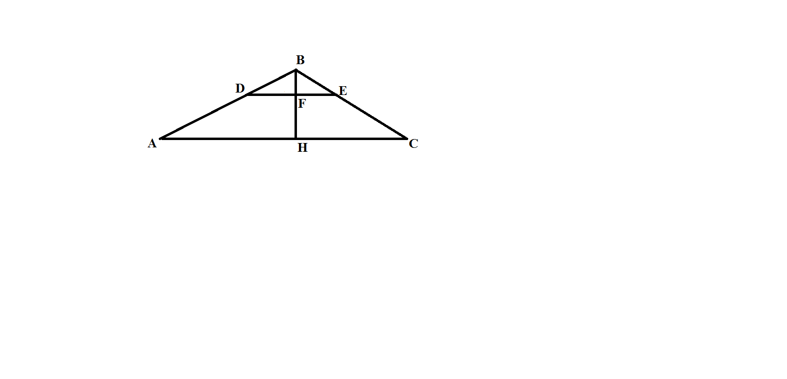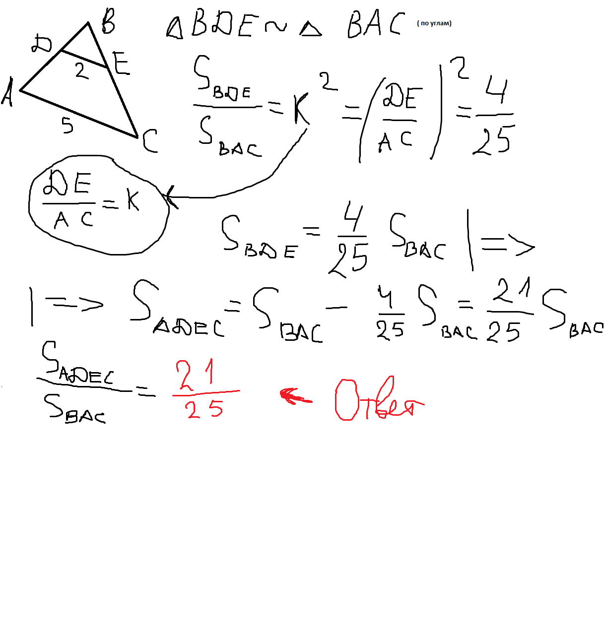 Получаем, что треугольник АВС подобен трегольнику DBE. Тогда получаем коэффициент подобия: