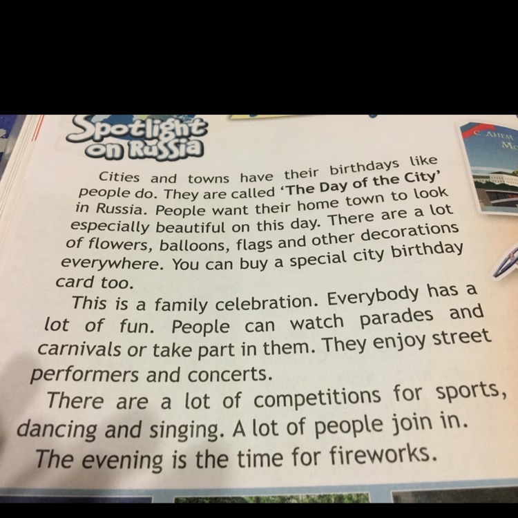Города имеют свои дни рождения, также, как и люди. В России они называются Днями Города. Люди хотят видеть свой родной город прекрасным в этот день. Там много цветов, шаров, флагов и других украшений везде. Вы можете купить специальную карту/картинку Дня Рождения. Это семейный праздник. Веселится каждый. Люди обожают уличные представления и концерты. Там много соревнований по спорту, танцам и вокалу. Приходят множество людей. Вечер - время фейрверков