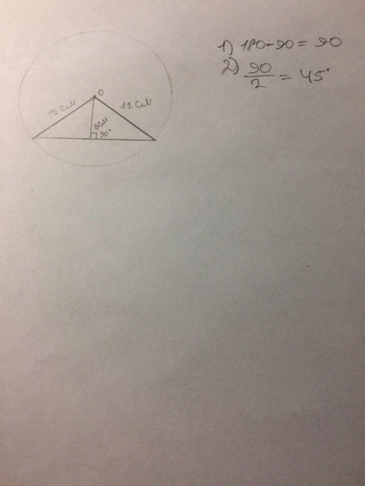 Дана окружность радиусом 12 см. Расстояние от центра окружности до хорды равно 6 см. Найдите угол между радиусами, проведенными к концам хорды.