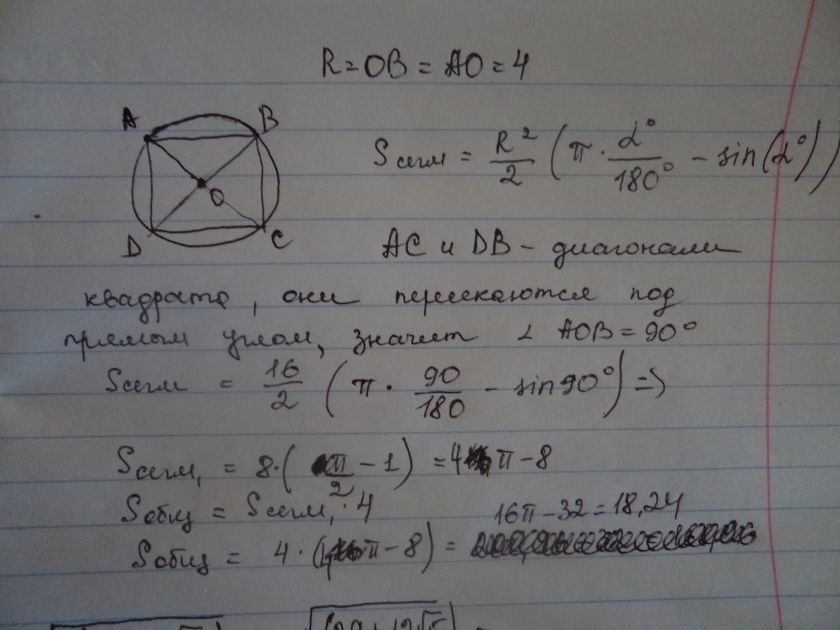 В круг радиусом 4 вписан квадрат.Найдите площадь части круга,не накрытого квадратом.