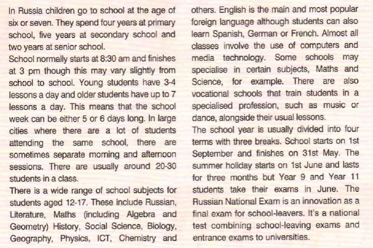 В России дети начинают ходить в школу в возрасте 6-7 лет. Они учатся 4 года в начальной, 5 лет в средней и 2 года в старшей школе.