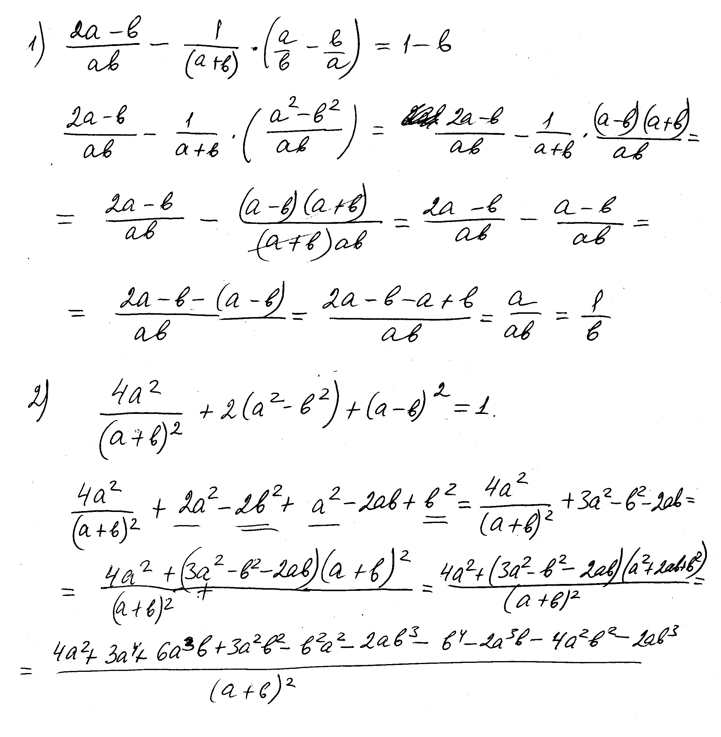 Докажите тождество. 1. ((2a-b)/(a*b))-((1)/(a+b)*((a/b)-(b/a))=(1-b) 2. 4a^2/((a+b)^2+2(a^2-b^2)+(a-b)^2=1