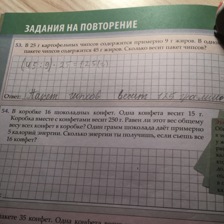 В коробке 16 шоколадных конфет. одна конфета весит 15 г. Коробка вместе с конфетами весит 250 г . Равиль этот вес общему весу всех конфет в коробке? 1 г шоколада дает примерно 5 калорий энергии? Сколько энергии ты получишь если съешь все 16 конфет?