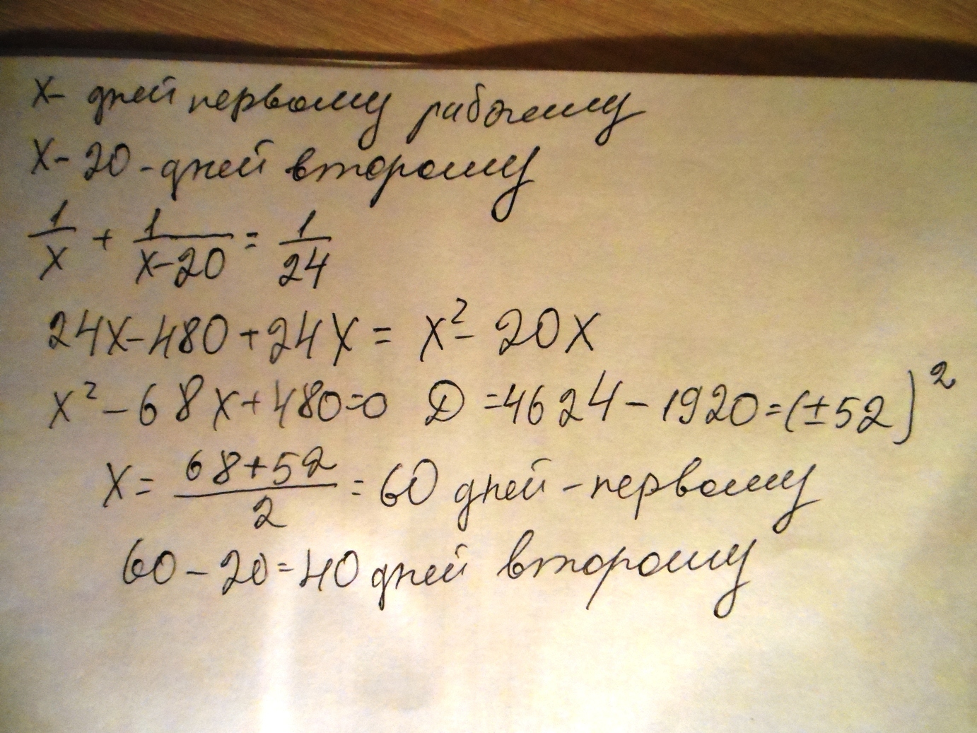 Двое рабочих, работая вместе, могут выполнить задание за 24 дня. За колько дней может выполнить эту задачу каждий из них, работая самостоятельно, если первому для этого нужно на 20 дней больше, чем другому?